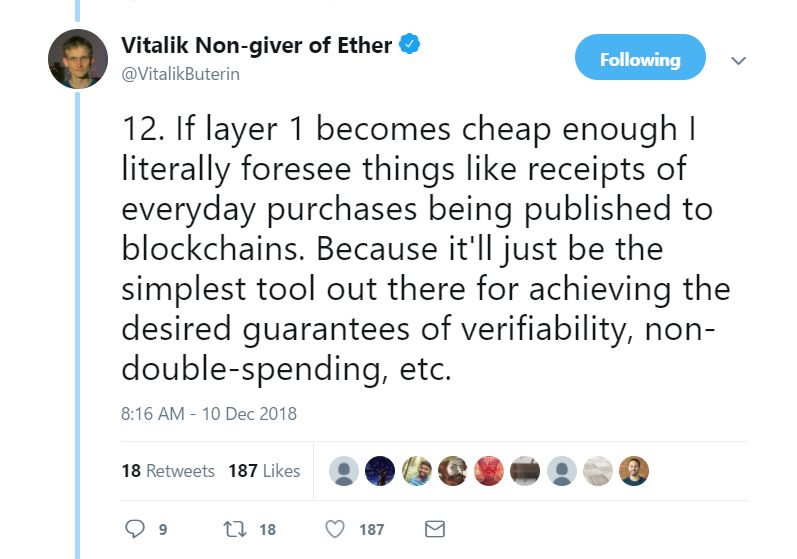 12. 如果第1层变得足够便宜,我简直可以预见,诸如我们日常消费的收据都会公布在区块链上。因为区块链是实现我们所需的可验证性和非双花消费的最简单的工具。