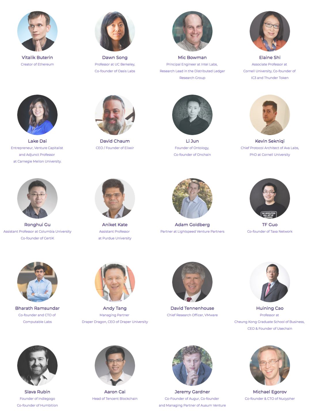 这次峰会将会分两个会场,一个会场专注于学术研讨,主要会由教授、学者、区块链核心开发者,带来最前沿的学术与技术分享:Vitalik Buterin、Jun Li、David Chaum等核心开发者,以及来自加州理工学院(CalTech)、加州大学伯克利分校(UC Berkeley)、康奈尔大学(Cornell U)、哥伦比亚大学(Columbia U)、华盛顿大学圣路易斯分校(Washington U at St. Louis)、英属哥伦比亚大学(UBC)、普渡大学(Purdue U)等世界顶尖高校的教授和研究者们,都会参与其中。