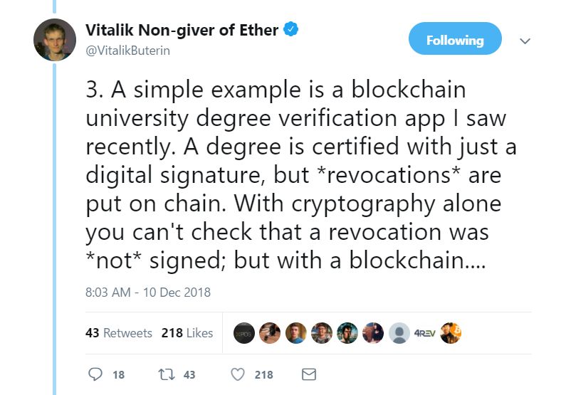 11月26日,Vitalik在接受媒体采访时表示,加密货币和跨境支付是区块链技术最适合的行业,而一些行业(如IBM)对区块链技术的误用导致了“浪费时间”。谈到非金融应用领域时,Vitalik表示他喜欢在新加坡所实施的大学学位认证想法。这项技术可让教育机构在区块链上以数位方式发放教育证书。