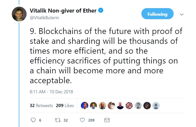 9. 未来实现 PoS 机制和分片技术的区块链将效率方面提升好几千倍,因此,将事务搬上区块链所带来的效率损失将会越来越得到人们的接受。