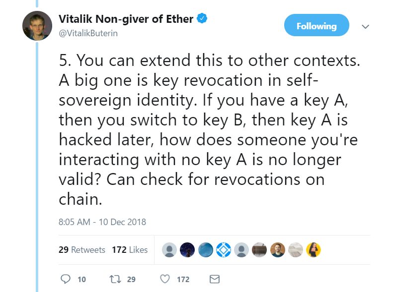 5. 你可以将这个例子延伸到其他情境中。其中一个很典型的就是在自主身份情境中的密钥撤销。如果你持有某个密钥A,之后你切换成了密钥B,随后密钥A被黑客攻击了,那如何才能让某个正在和你互动的人知道密钥A已经无效了呢?查看一下链上的撤销记录就可以了。