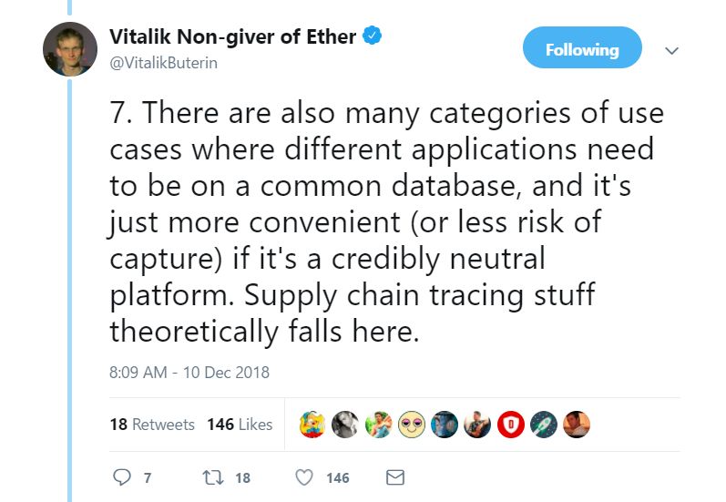 7. 区块链还有很多其他类型的用例,这些用例都需要建立在一个公用数据库的基础上,且如果某个平台在中立性方面靠得住,那就更加方便了(或者存在更少被操控的风险)。从理论上来说,供应链追踪就是如此。