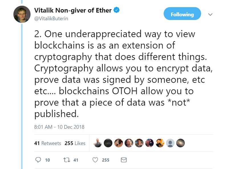2. 有个不被重视的观点是将区块链视为密码学的延伸,认为区块链领域从事的是与密码学不一样的事情。密码学允许我们对数据进行加密、证明数据是由某个人签名过了的...而区块链允许我们证明某条数据*没有*被公布出去。