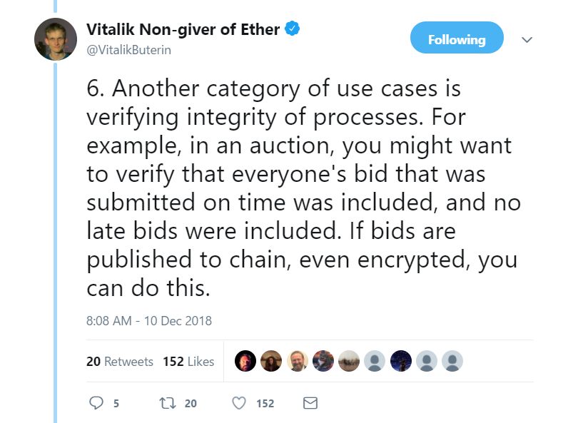 6. 另一种类型的用例是验证流程的完整性。比如,在拍卖流程中,你可能想核实是否每个准时提交了竞价的人都被囊括进来了,且那些没有准时提交竞价的人被排除出去了。如果竞价在区块链上公布了出来,甚至进行加密了,那你就可以进行核实。