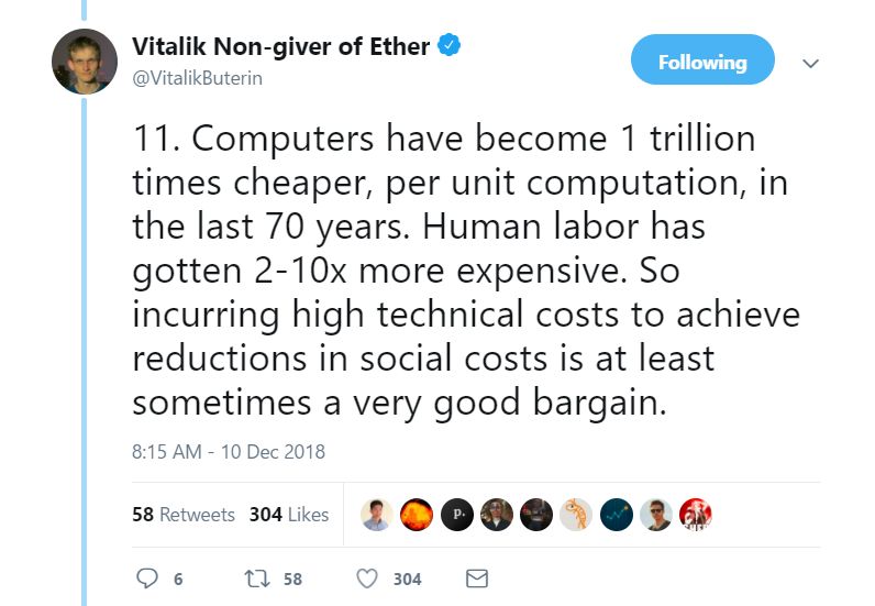11. 在过去70年里,每台计算机已经便宜了1万亿倍。人类劳动力成本也涨了2-10倍。因此,为降低社会成本而带来的技术成本的增加,这是非常划算的一件事。