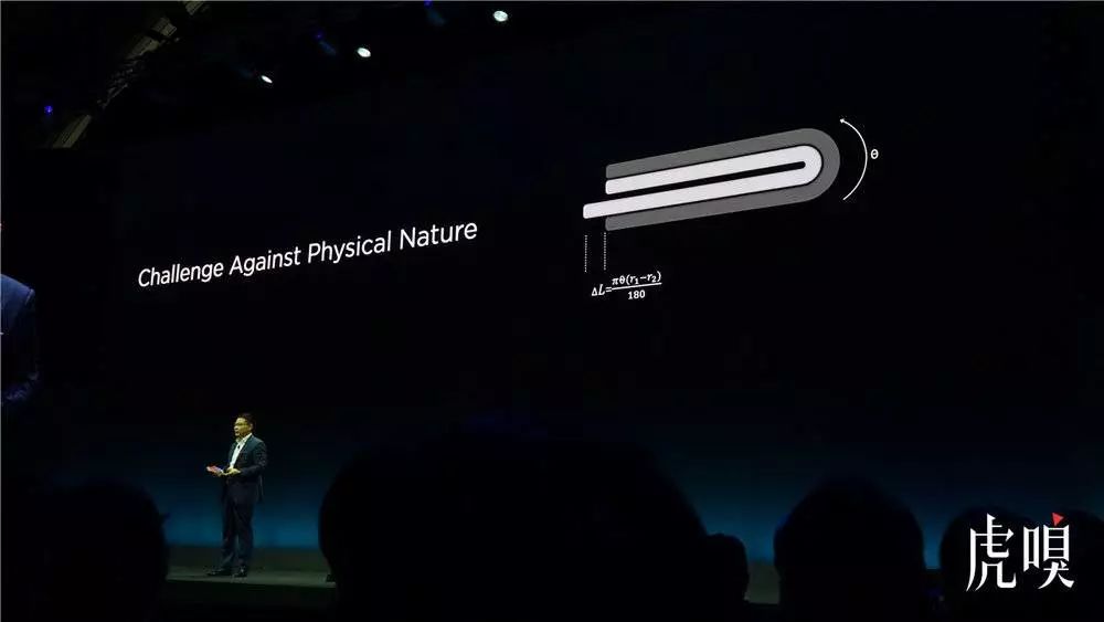 而在折叠屏手机相当关键的折叠转轴上,华为也下了不少功夫,在这套被余承东称为“True Back-to-back Fold(真·背对背弯折)”的结构中,铰链的地位异常重要。余总甚至在现场直接展示了一个公式,说明像手机这样的产品,在弯折的时候实际上铰链要同时起到转动和长度变化,所以架构上非常复杂。以华为自己的铰链为例,就是用了超过100个的零部件。