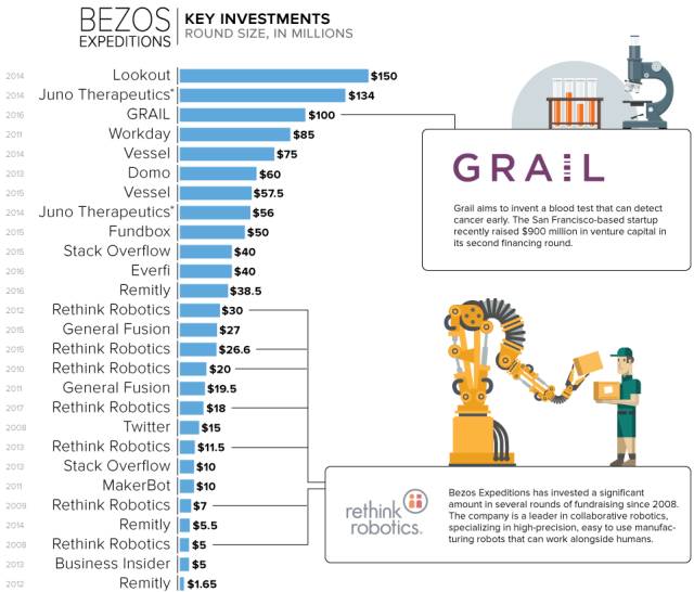 利用血液样本筛查癌症越来越流行,因为与传统切片检查相比,抽血筛查的费用更低,而且伤害性更小。2016 年,基因测序公司 Illumina 日前组建新公司 Grail,目标是开发「泛癌症」筛查测试技术,可以为人们提供早期癌症诊断,即使还没有出现相关病症。Illumina 首席执行官杰伊·弗拉特利(Jay Flatley)称:「这是一个庞大的市场,估计其市场价值高达 200 亿美元到 2000 亿美元。」不过,正如 Grail 的名字所暗示,癌症筛查测试现在非常热门,但也是个很难实现的目标。但是,据说贝索斯对这个项目很兴奋。投资意味着贝索斯相信对数据和处理性能有巨大需求的基因组学将成为一个重要的计算领域。亚马逊现在拥有的 AI 工具也意味着公司在一个群雄逐鹿的医疗保健领域中,处在很有利的位置。