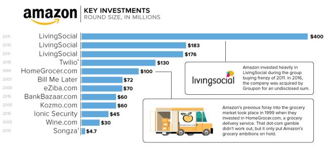 亚马逊百万美元级别的投资中,不少集中在亚马逊扩张业务种类(不能只卖书!)阶段,比如,1999 年收购的食品杂货网络电商 HomeGrocer.com。当时,亚马逊还疯狂收购了其他药物、宠物用品、运动用品等购物网站。另外,也投资了优惠券创业公司 Living Social,不过,这家曾经的超级独角兽最终轰然倒下。