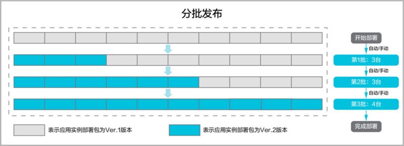 • Batch Rolling : 分批发布 XX 批,发布后自动 / 手动继续发布下一批。