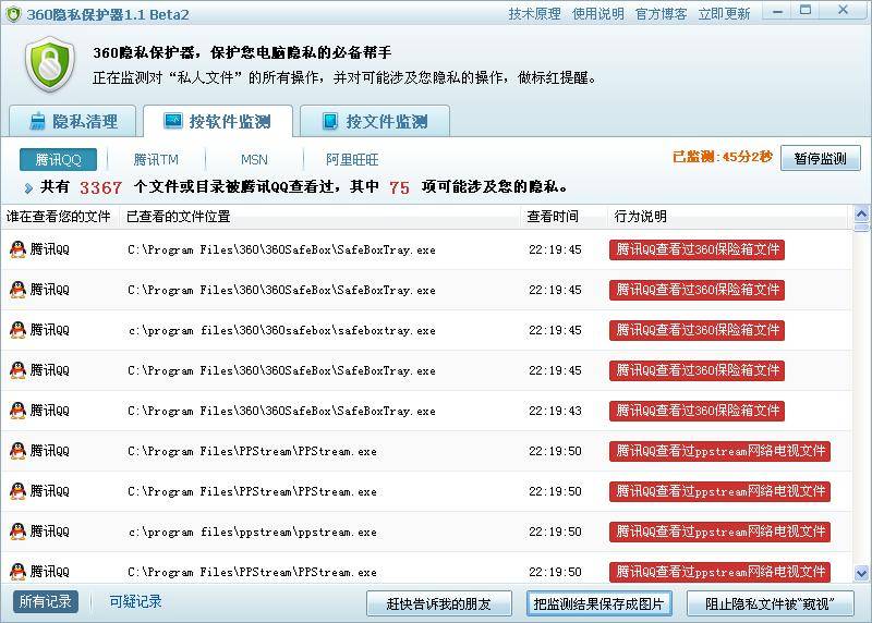 两位大佬的沟通就这样不欢而散,周鸿祎再次召集员工回公司商议具体对策,并于一周后召集工程师封闭开发了迎战腾讯进攻的武器 —— 360 隐私保护器。这款软件的针对性极强,其功能主要在于帮助用户监控电脑中的软件在系统后台的所有行为。对此腾讯联合多家公司发表联合声明,讨伐 360 将“正常的用户操作和 QQ 安全检查模块诬蔑为腾讯 QQ 窥视用户隐私。任何第三方程序凡是名字被修改为‘QQ.exe’后,都会被提示窥视隐私”。
