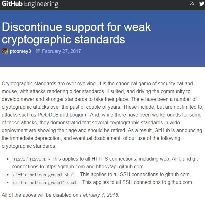 2017 年 2 月底的时候,GitHub 曾在 GitHub engineering 博客中宣布,他们将会停止支持弱加密标准。