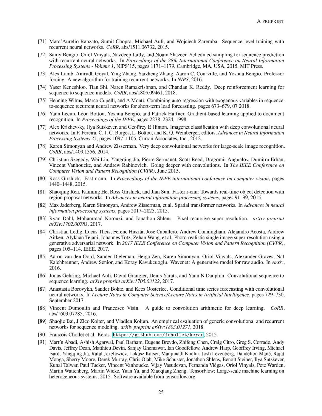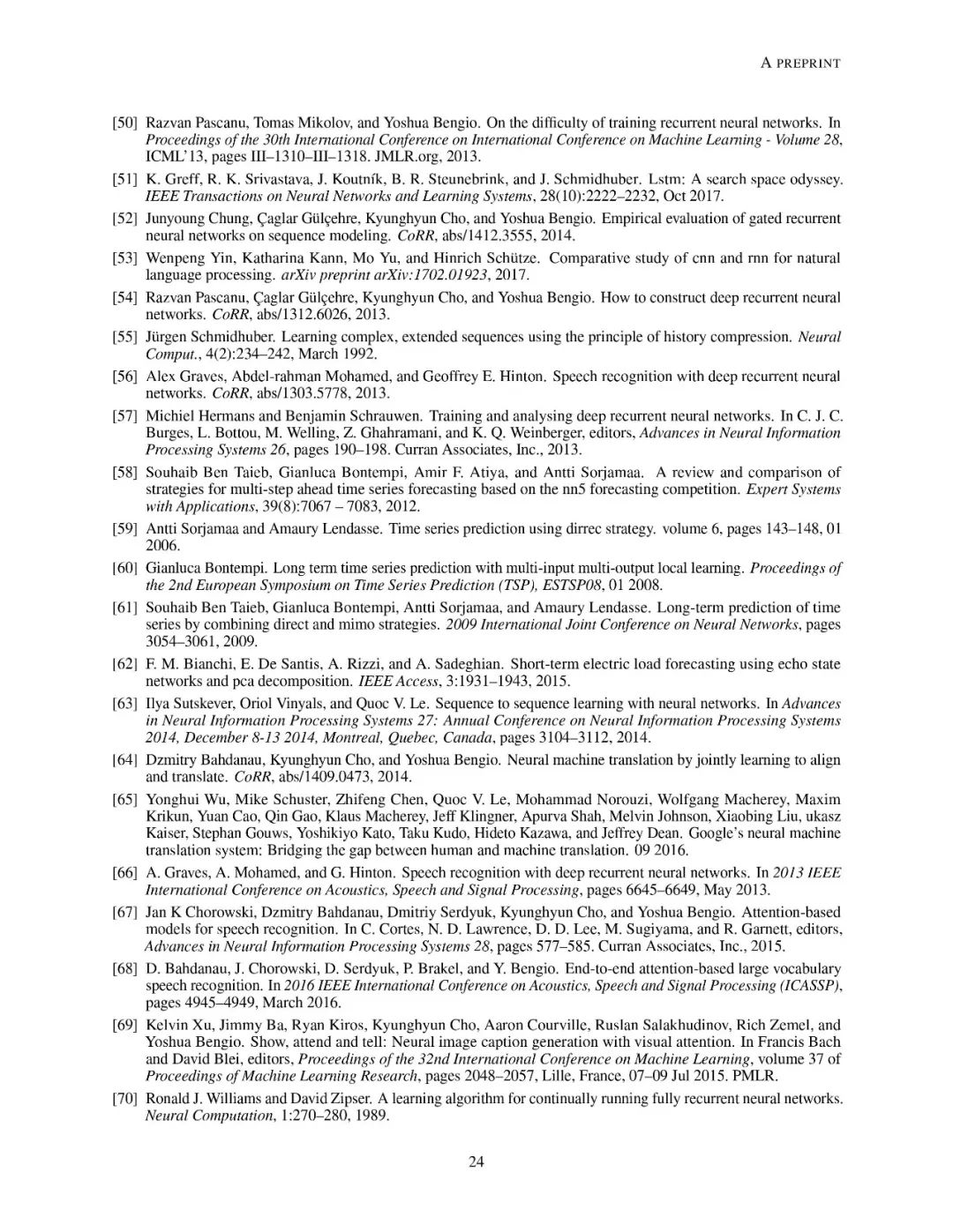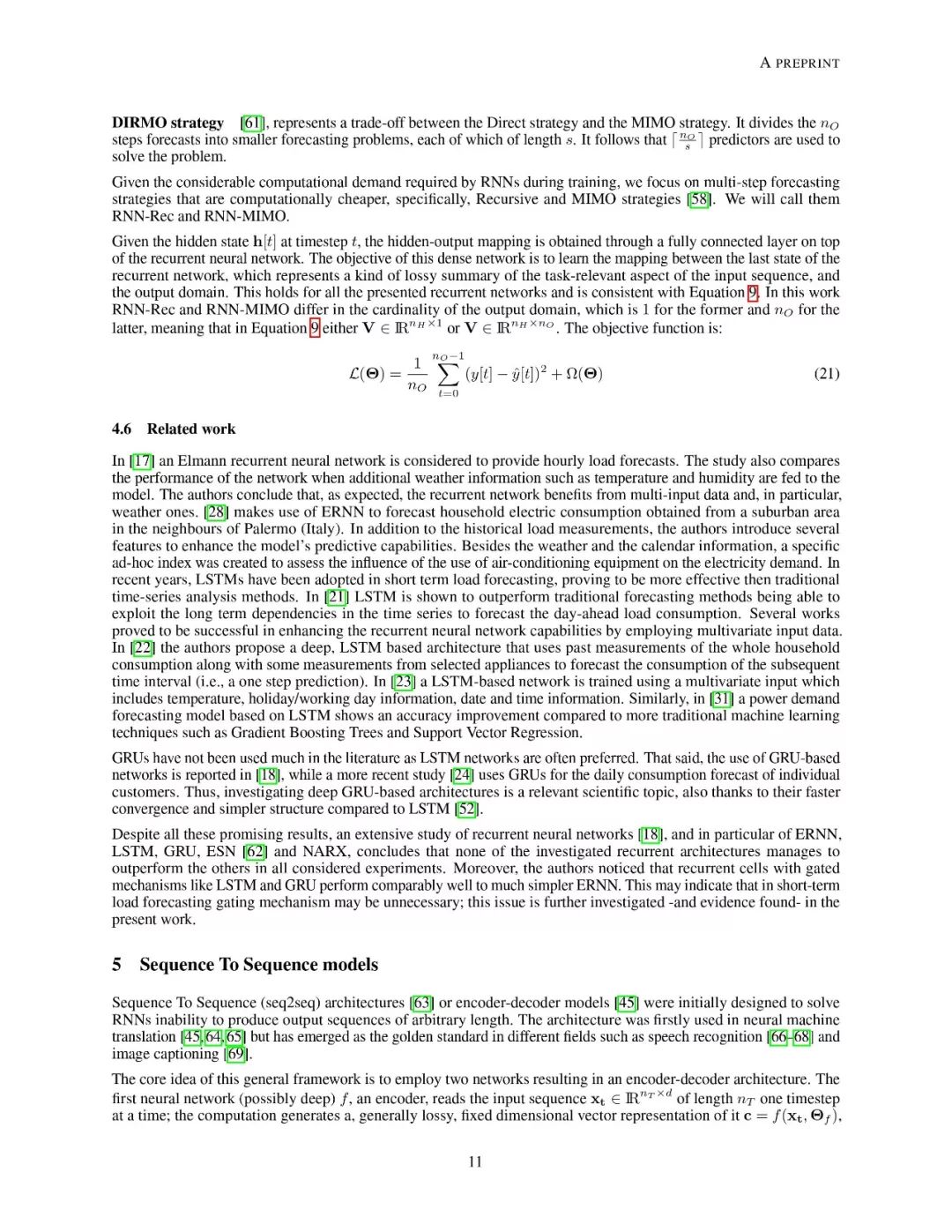 文章组织结构如下:第2章介绍了预测问题模型以及文中使用到的符号定义。之后章节分别介绍了前馈神经网络和与学习预测任务相关的概念定义;递归神经网络的总体概述和目前最先进的两种变体架构:长短时记忆网络和门控递归单元网络;接下来详述了序列到序列结构(seq2seq)对递归神经网络的提升;同时也分析了卷积神经网络和时域卷积网络。最后,作者介绍了来自真实场景的数据集,可以用于对各个方法模型进行性能对比。