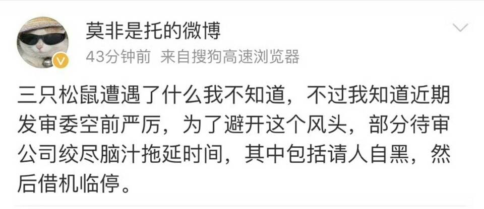 综合报道 12月12日晚间,证监会发审委取消原定于12月13日审议的三只松鼠股份有限公司首发事宜。有媒体爆料,IPO临停原因是遭自媒体勒索,也有评论人士称另有隐情。