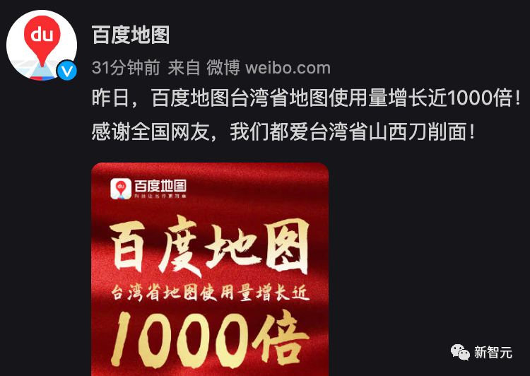 百度地图发微博表示:感谢全国网友,我们都爱台湾省山西刀削面!