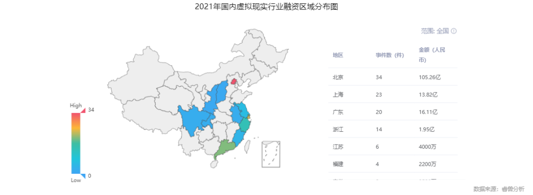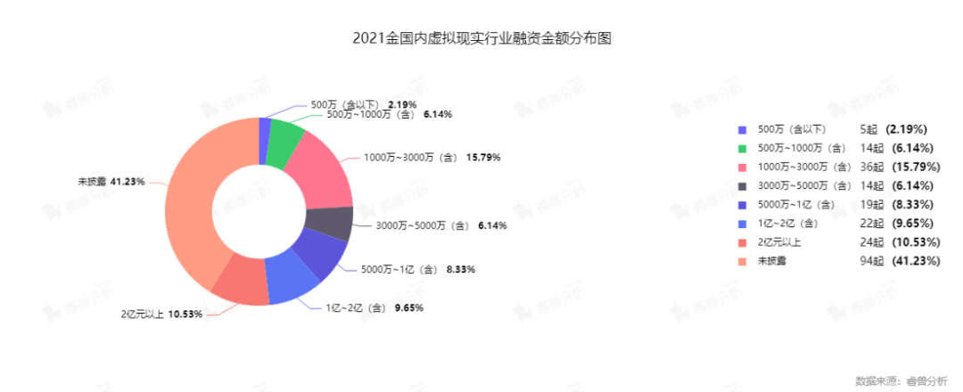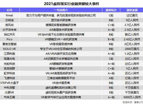 据睿兽分析显示,2021年全年VR/AR行业发生融资事件226起,融资金额约412.52亿元人民币。在近眼显示、交感知交互、内容制作等领域一批优质企业逐步成熟化,同时一批新生企业也崭露头角。