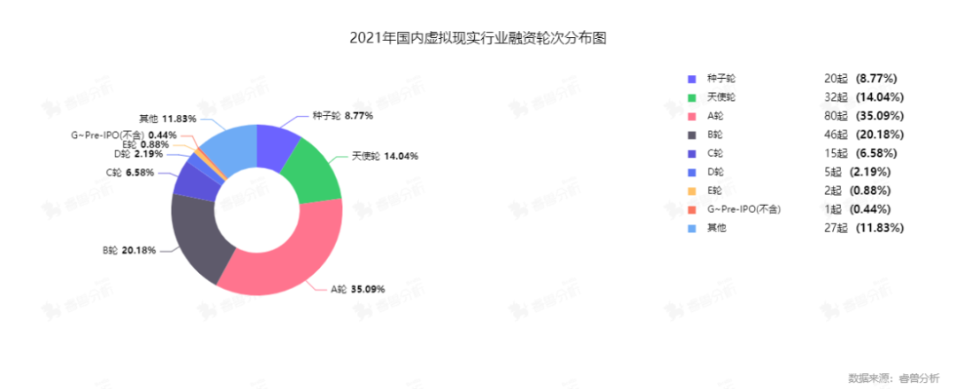 据睿兽分析显示,2021年全年VR/AR行业发生融资事件228起,融资金额约502.52亿元人民币。其中从融资轮次看,主要集中在A轮和B轮,A轮最多为80起,占融资事件的35.09%。