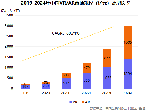 2020 年全球 VR/AR 市场规模约为900亿元人民币,同年中国VR/AR市场规模约为300亿元人民币,占当年全球市场的30%。伴随着5G技术的快速发展和元宇宙的爆发,中国虚拟现实市场规模将呈现高速增长,预计2020年-2024年中国虚拟现实产业复合增长率达到69.71%。