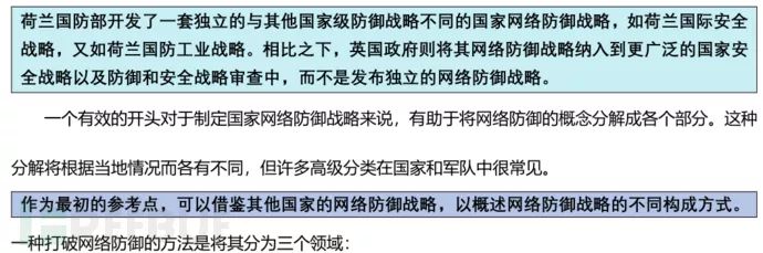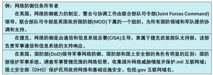 网络防御战略作为实施网络防御活动的框架,通常包括多个长期目标,在不同领域指派不同的任务所有者。