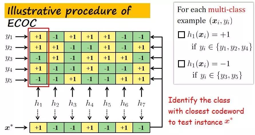 以第一类作为一个例子,Y1Y2Y4对应编码值是+1,Y3和Y5对应编码值是-1,这样便可以把Y1,Y2,Y4看成一个正划分,Y3和Y5看成一个负划分。这个时候对于任何多类训练样本,每一个对象都有一个对应标记是训练样本。如果Y2落在正划分里面,我们就认为这个训练样本是一个正样本,如果Y2落在负划分里面,我们便认为这个训练样本是一个负样本。