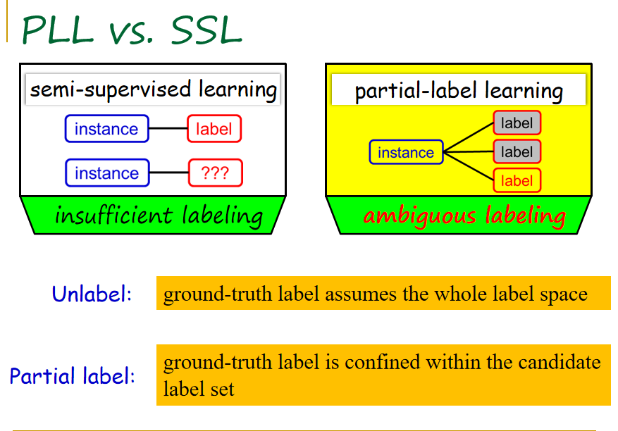 张教授将偏标记学习和半监督学习进行了比较。其相同之处在于,半监督学习中未标记对象的真实标记是不明确的;偏标记学习中训练样本的标记也是不明确的。不同之处在于,对于半监督学习,真实标记取值空间或者范围是整个标记空间,其中任何一个标记都可能是它的真实标记。对于偏标记学习,真实标记取值范围只能位于侯选标记集合中,其标记范围是限定的。