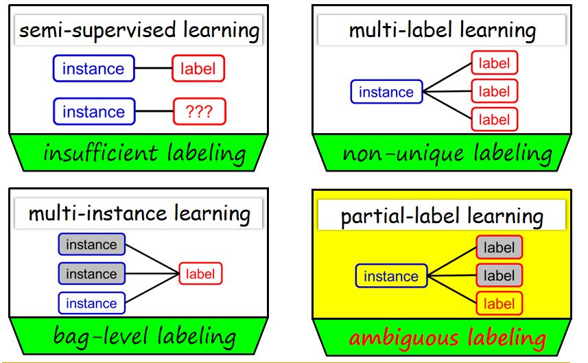 如果把偏标记学习与多事例学习做对比,相同之处在于,基于对象和事例的标记都是未知的。不同之处在于,对于多事例学习而言,它的歧异性出现在输入端,每一个对象由多个事例表示;而偏标记学习的歧异性出现在输出端,其有多个侯选标记,但并不知道哪一个为真实标记。