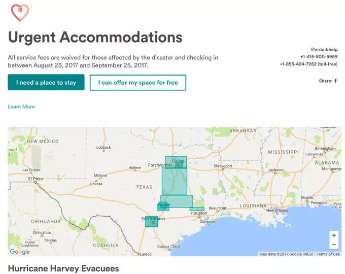 如果避难所没有位置,那就看看有没有好心人收留。在Harvey来临期间,Airbnb向用户公布了紧急住所信息,将提供免费住宿的房东和因飓风而无家可归的住户相匹配,并免收服务费用。
