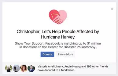 飓风过后,没有保险保障的居民,在经济上或许会有比较大的压力,这时候只能靠社会关怀了。在Harvey飓风期间,Facebook在用户界面的顶端放置了捐款的广告链接,用户可以通过该链接跳转到灾害慈善中心的Facebook公众页面,进行捐款。谷歌也与美国红十字会合作,共为Harvey飓风灾民募得捐款14万美元。苹果也在iTunes和App Store上面添加了一键捐款的按钮,用户可以非常方便地进行捐款。
