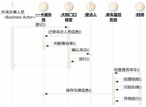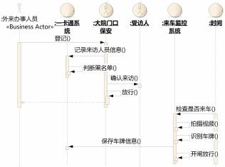 3. 根据以下业务序列图,请问属于“一卡通系统”执行者的是(可多选) A) 外来办事人员 B) 一卡通系统 C) 大院门口保安 D) 受访人\ E) 来车监控系统 F) 时间 |