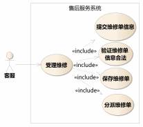 7. 以下用例图的错误应该如何改正? A) 提交维修单信息是客服的责任,应该删掉 B) 将<<include>>箭头方向反过来 C) 右边四个只是步骤不是用例,删掉 D) 标出各用例的先后顺序 E) 将<<include>>改成<<extend>> F) 将右边四个放在下一层次用例包中 |