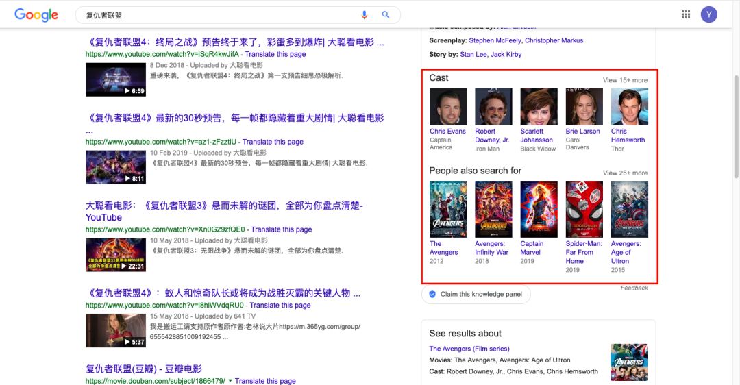 最常见的应用就是搜索引擎。Google 最初提出「知识图谱」的概念,就是为了更好地服务于搜索引擎。例如:在搜索框内输入“复仇者联盟”,系统就会通过构筑好的知识图谱,将这一系列电影的视频、演员、评论等信息展示出来。