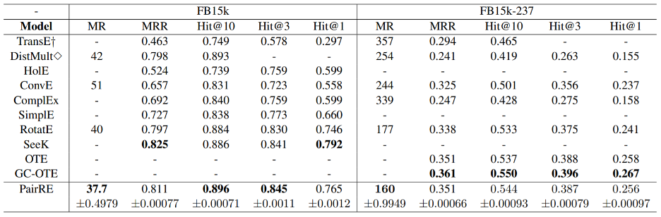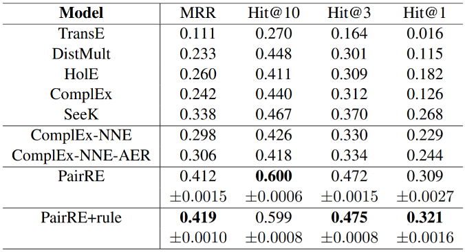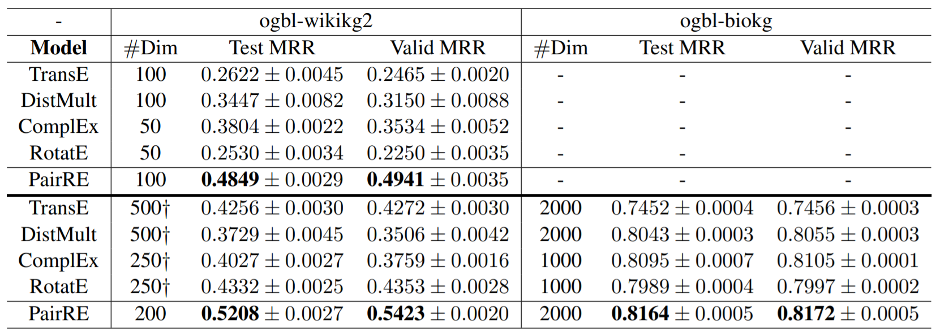 上图是本文的主实验结果,可以看到Pair相比于RotatE在各个设定下都取得了更好的效果,如果嵌入向量的维度能够升高到500,效果可能会进一步提升。