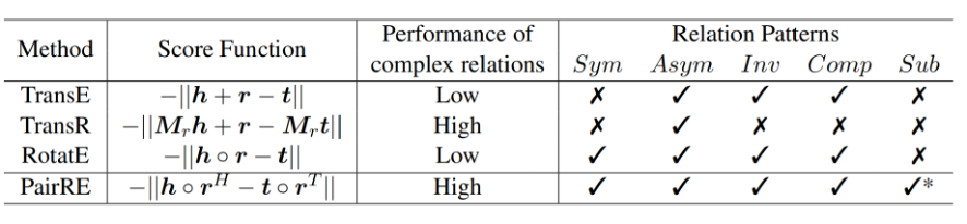 PairRE和前面提到的几种方法的比较如下,可以看出相比于RotatE,论文提出的PairRE方法在复杂关系表示上表现更优,同时在关系模式的编码上能够编码子(Sub)关系。