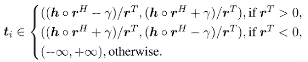 相比于其他方法,PairRE允许一个实体在不同的关系中有分布式表示,并且成对的关系向量能够对损失函数中的边际进行自适应调整,从而缓解复杂关系的表示问题。例如在1对N的关系补全(h, r, ?)中,由正确的尾实体集合S = {t_1,t_2,…,t_N},论文基于固定边际参数γ的设计了t_i的取值范围: