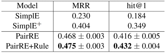论文还针对子关系模式做了补充实验,将PairRE同ComplEx-NNE-AER和SimplE^+进行对比,这两种方法通过设计子关系规则进行语义匹配。论文同时借鉴了ComplEx-NNE-AER中的规则,对本来的损失函数进行改变如下: