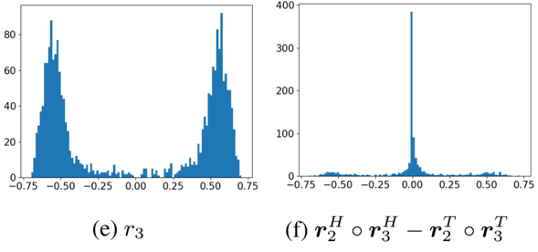 对于关系模式问题,论文在嵌入向量维度为500下取DB100k中的对称关系r_1:spouse和非对称关系r_2:tv_station/owner,对称关系编码满足r^(H^2 )=r^(T^2 ),编码效果如下: