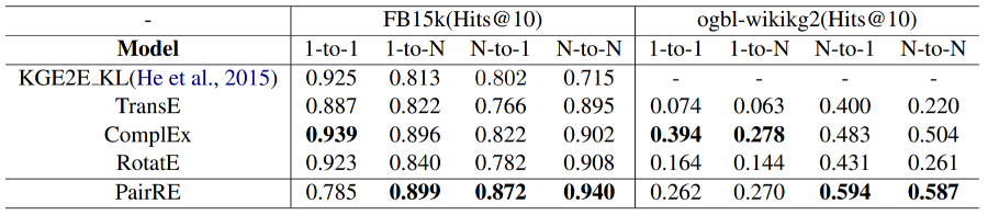 论文提出的PairRE方法用成对的向量表示每个关系,使损失函数中的余量能够自适应调整,以适应不同的复杂关系,在复杂度略有增加的情况下有效地解决了知识图谱嵌入中的问题。除了对称/不对称、逆向和组合关系之外,PairRE还可以通过对关系表示的简单约束编码子关系。在大规模数据集ogbl-wikikg2上,PairRE取得了最优效果。