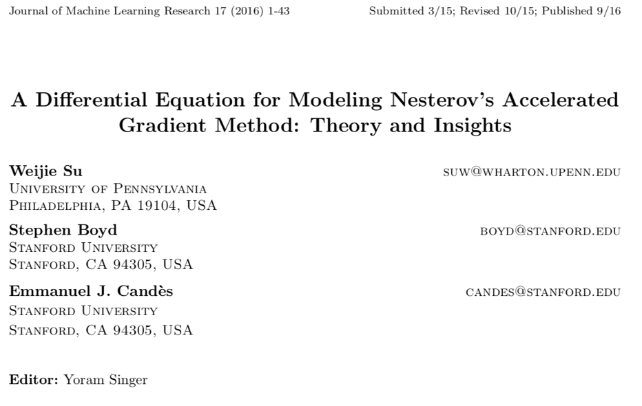 [1] W. Su, S. Boyd, and E. Candes. A differential equation for modeling Nesterov’s accelerated gradient method: Theory and insights. Journal of Machine Learning Research, 17(1):5312–5354, 2016.