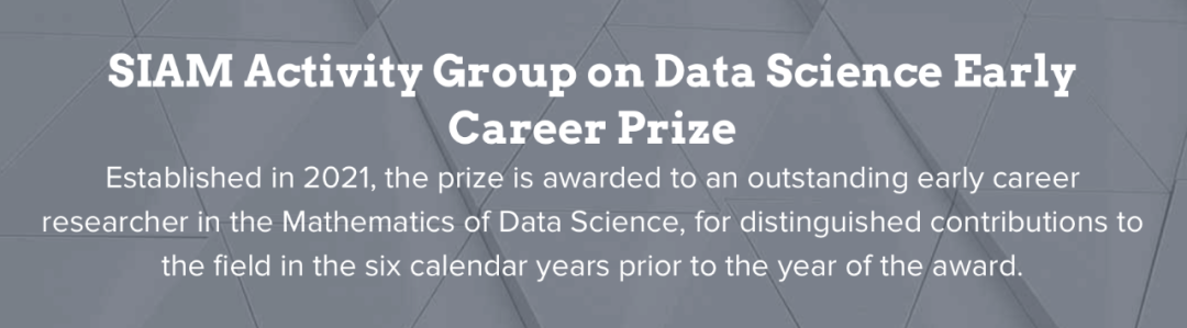 SIAM数据科学青年奖由SIAM(美国工业与应用数学学会)每两年在全世界范围颁发一次,旨在奖励一名在数据科学领域做出杰出贡献的青年学者。
