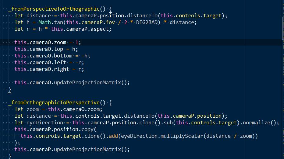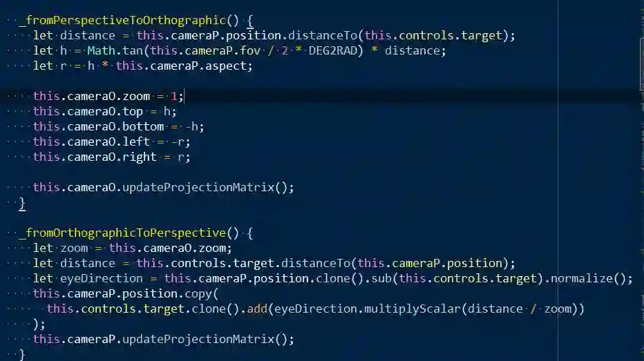 因为用户会在2D、3D场景下做很多操作,比如平移、缩放、旋转,要想无缝切换,这个关键在于将平行投影与视锥体相机的位置、lookAt方式保持一致;以及将他们放大缩小的关键点:distance的比例与zoom来保持一致。
