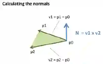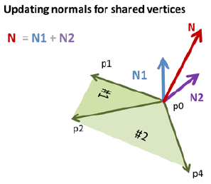 如果一个顶点被多个三角形共享,共享顶点的法向量等于共享顶点在不同的三角形中的法向量的和。N=N1+N2;
