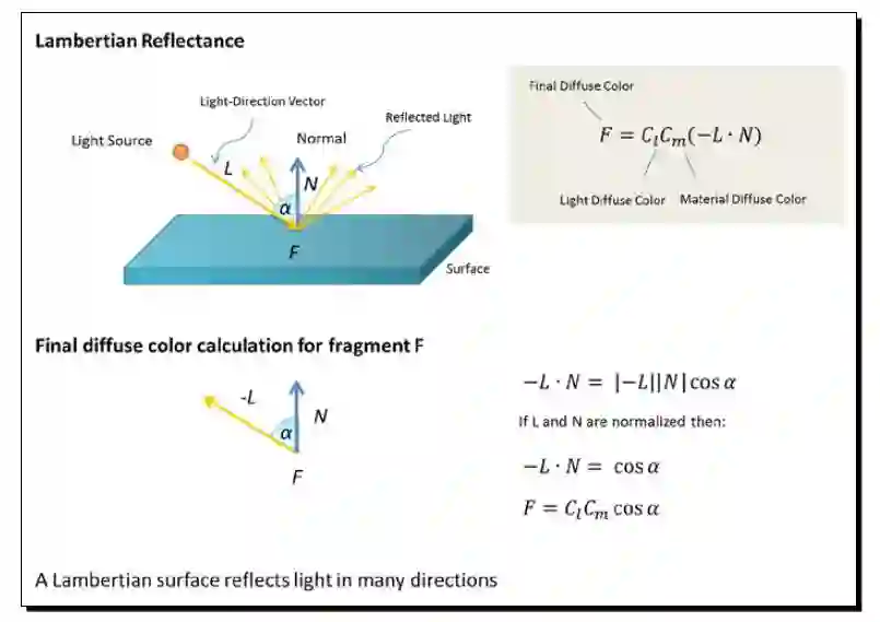 开发过程中设计给了一套配色,然而一旦有光源,面块的最终颜色就会与光源混合,颜色自然与最终设计的颜色大相径庭。下面是Lambert光照模型的混合算法。