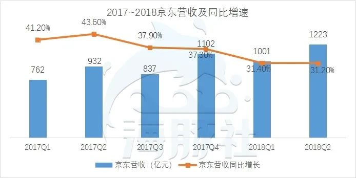 但是,从2017年到2018年,阿里巴巴的营收增速一直高于京东,在海外市场和线下新零售都有建树。当阿里核心电商还有60%左右的增速,京东的营收增速却从2017年的40%左右,一路下滑到2018年的30%。