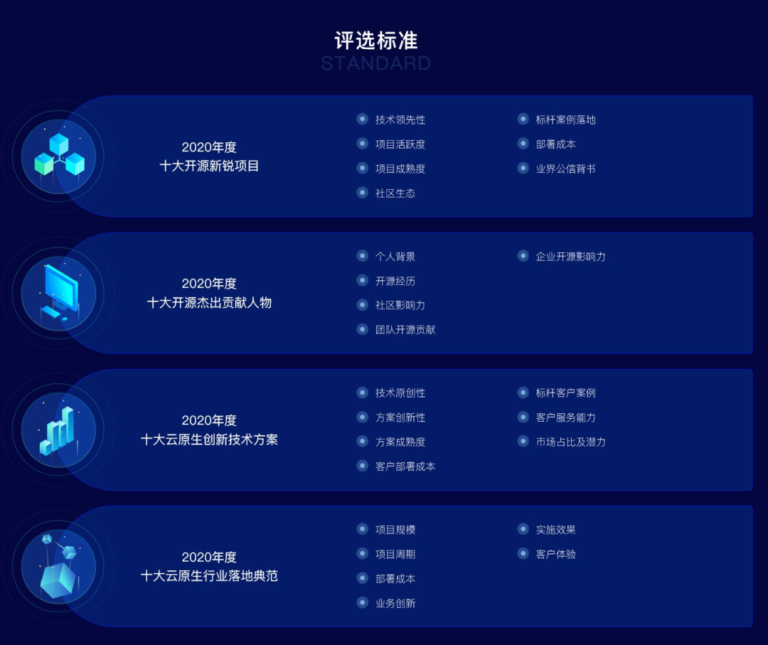 本次云原生、开源两大系列,四大榜单分别为:2020 年度十大开源新锐项目、2020 年度十大开源杰出贡献人物、2020 年度十大云原生创新技术方案以及 2020 年度十大云原生行业落地典范。