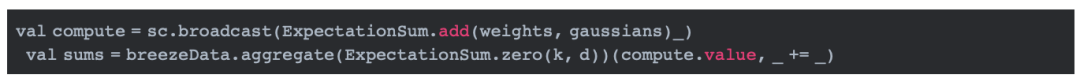 调用RDD的aggregate方法,我们可以基于所有给定数据计算上面的值。利用计算的这些新值,我们可以在M-步中更新mu和sigma。