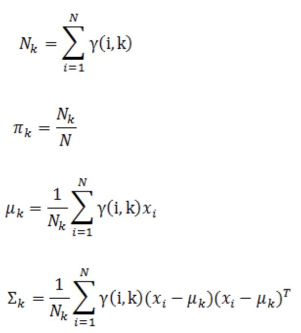 M-步。估计每个组件的参数。由于每个组件都是一个标准的高斯分布,可以很容易分布求出最大似然所对应的参数值,分别如下公式: