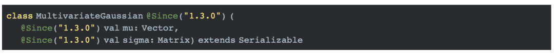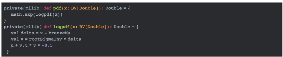 在上面的求参代码中,我们用到了MultivariateGaussian以及MultivariateGaussian中的部分方法,如pdf。MultivariateGaussian定义如下: