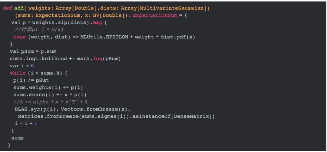 基于E-步计算出来的值,根据公式**(6),我们可以通过(mean /= weight)来更新mu;根据公式(7),我们可以通过BLAS.syr()来更新sigma;同时,根据公式(5), 我们可以通过weight / sumWeights来计算pi。