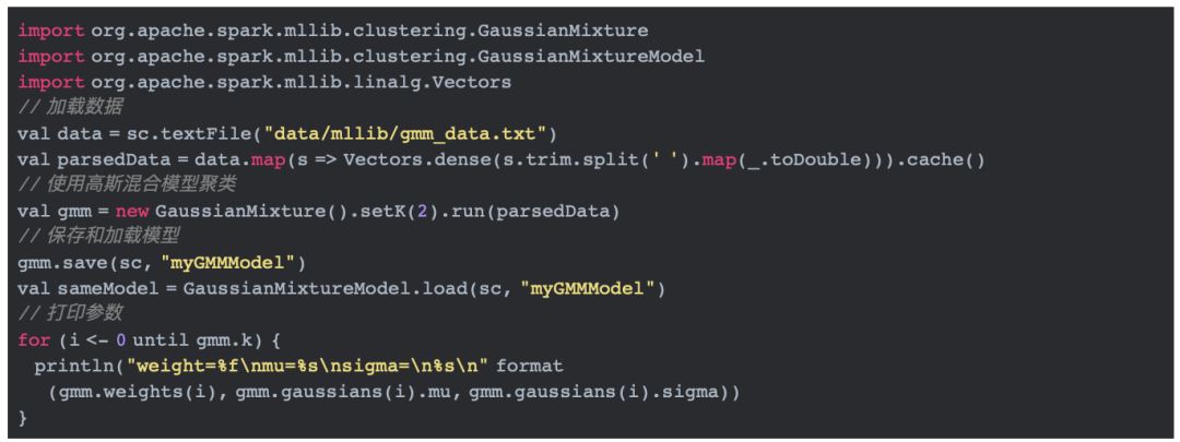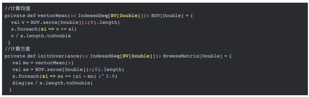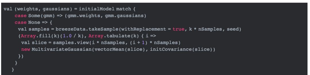 在上面的代码中,当initialModel为空时,用所有值均为1.0/k的数组初始化权重,用值为MultivariateGaussian对象的数组初始化所有的高斯分布(即上文中提到的组件)。 每一个MultivariateGaussian对象都由从数据集中抽样的子集计算而来。这里用样本数据的均值和方差初始化MultivariateGaussian的mu和sigma。