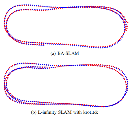 图2 估计相机的位姿(红点)上叠加了真值(蓝点)。分别对应(a)BA-SLAM和(b)L-infinity SLAM用提出来的krot_tdc解决闭环检测。