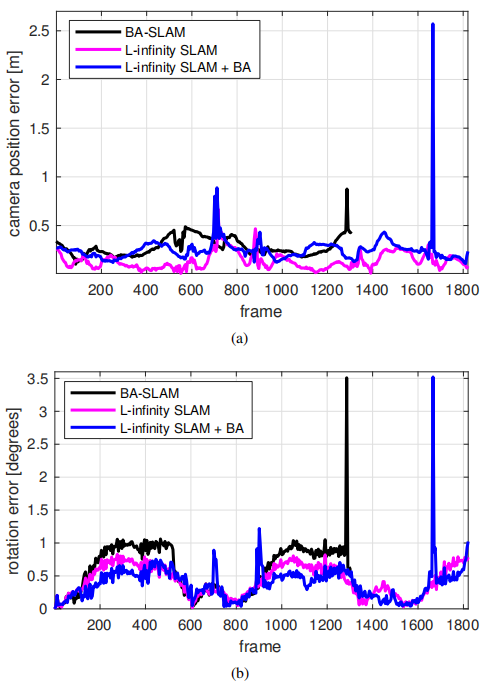 图1 (a)相机平移误差,(b)在Maptek数据集上测试的BA-SLAM和L-infinity SLAM的旋转误差。对比包括在相同的特征跟踪下krot_tdc fed的BA结果。
